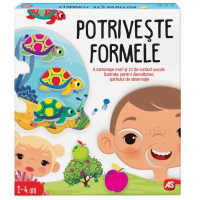 Potriveste formele este un joc format din 4 tablouri de bord mari si 22 de carti ilustrate. Fiecare tablou este format din 5 adancituri care potrivesc 5 carti cu obiecte de aceeasi forma. Copiii pot incepe sa joace pur si simplu observand imaginile de pe cartonase si plasandu-le pe tabloul de bord acolo unde se potrivesc. Pe masura ce se familiarizeaza cu jocul se pot distra cu prietenii si familia lor jucand un joc de Bingo.Specificatii