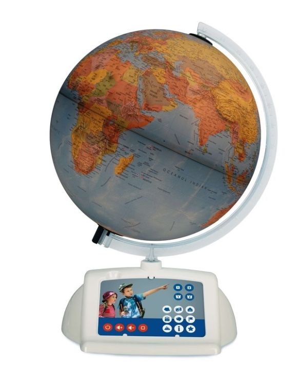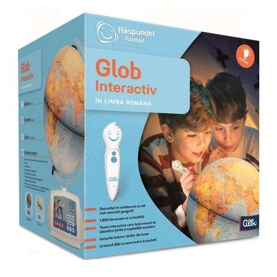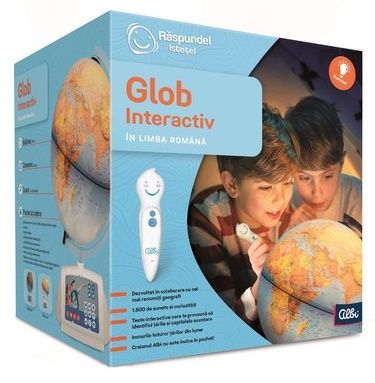 Exploreaza intreaga lume cu acest Glob Pamantesc Interactiv Afla noutati si curiozitati despre tari si orase asculta imnurile nationale si verifica-ti cunostintele prin teste distractive. Globul Interactiv contine peste 1800 de sunete si texte in limba romana inclusiv versiunea instrumentala a imnurilor nationale din 200 de tari. Vei afla numele tarilor capitalele lor limbile oficiale populatia informatii despre geografia fizica si economica diferite curiozitati si ce obiective turistice ai de vizitat in zona. Testele distractive grupate pe mai multe niveluri de dificultate te vor ajuta sa iti verifici cu usurinta cunostintele acumulate. Inaltimea 41 cm diametrul 30 cm scara 1 42. 000. 000. Pachetul contine un glob cu harta politica a lumii in limba romana un suport cu un card de comanda un brat un cablu USB care include un comutator un manual de utilizare si instructiuni de siguranta. Creionul ALBI si adaptorul AC DC nu sunt incluse in pachet ATENTIE pentru a utiliza functia interactiva a Globului folositi creionul optic Albi din colectia Raspundel Istetel. Creionul se achizitioneaza separat.Specificatii