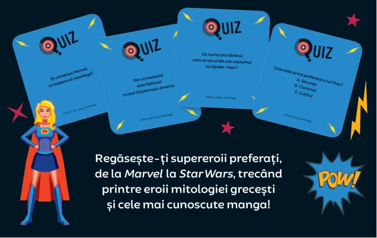 Jocul de tip quiz Supereroi este destinat pasionatilor de benzi desenate, filme si seriale cu supereroi. Este structurat sub forma de intrebari si raspunsuri, avand ca scop testarea cunostintelor jucatorilor despre universuri fictionale populare precum Marvel, DC Comics, Star Wars, Naruto, si multe altele.