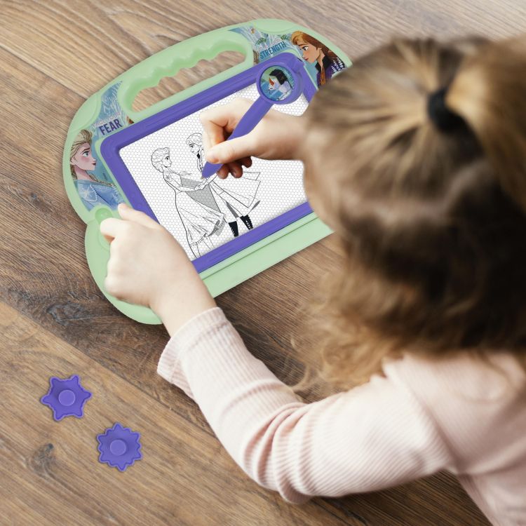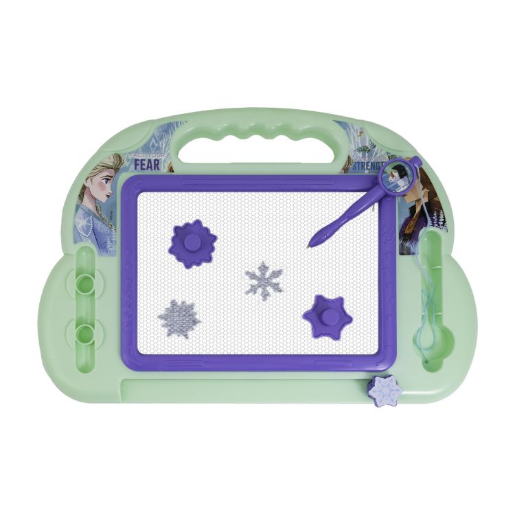 Cu tabla magnetica Magic Scribbler distractia nu se termina nicioadata! Tablita functioneaza datorita fortei magnetice: copilul deseneaza cu un stilou magic special (varful are un mic magnet), iar pe tablita se formeaza un desen frumos! La final, trece glisorul special si desenul va disparea si poate incepe un nou desen. Tablita este echipata cu doi magneti de diferite forme, care pot diversifica suplimentar distractia. Cu un design colorat si atragator - cu elemente din filmul Regatul de Gheata 2, tablita are un maner din plastic pentru o transportare usoara, perfecta pentru diversificarea timpului liber pentru fiecare copil care iubeste distractia creativa.