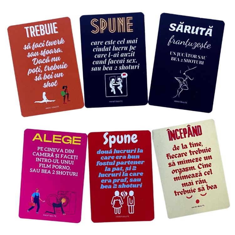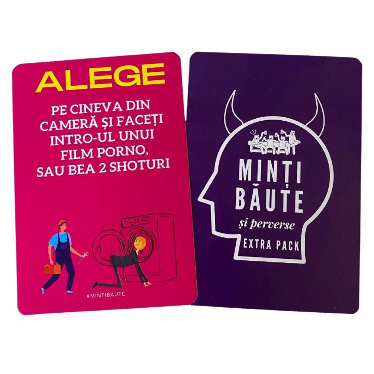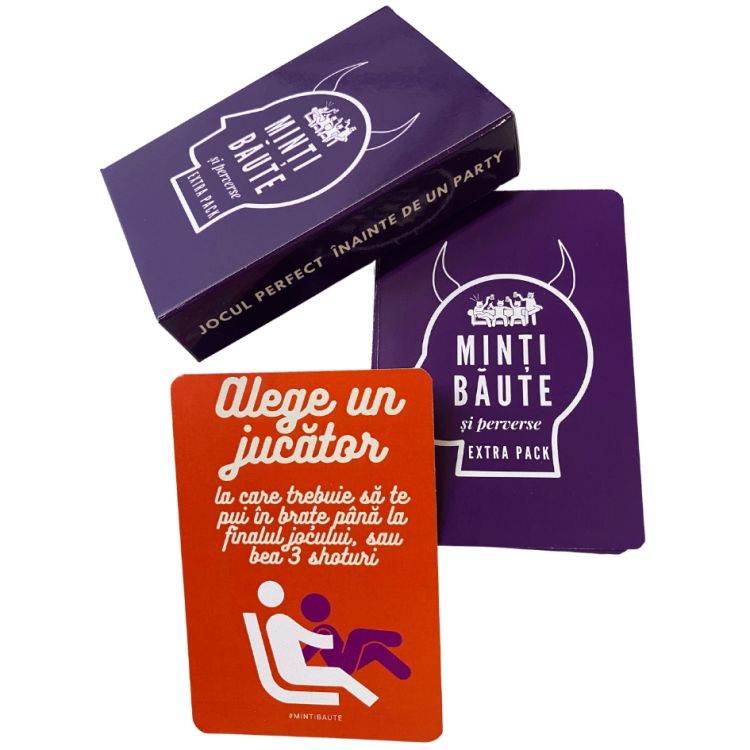 Jocul de carti Minti Baute si Perverse este un extrapack la jocul de carti original Minti Baute. Acesta este pe acelasi principiu adevar sau provocare si poate sa fie jucat la o petrecere cabana sau o seara cu prietenii. Pentru ca este un extrapack acesta contine 58 de carti de joc iar majoritatea intrebarilor sunt putin mai perverse dar daca nu vreti sa le faceti puteti scapa de provocare daca beti. Cut totii stim ca cele mai reusite iesiri in oras sau la cabana incep de fiecare data daca ne strangem inainte la cineva acasa. Si de multe ori ramanem fara povesti sau suntem mai timizi iar cu acest joc reusesti sa scapi de toate inhibitile si sa ai cea mai reusita seara. Recomandam sa fie jucat impreuna cu jocul de carti Minti Baute original pachetul negru .Specificatii