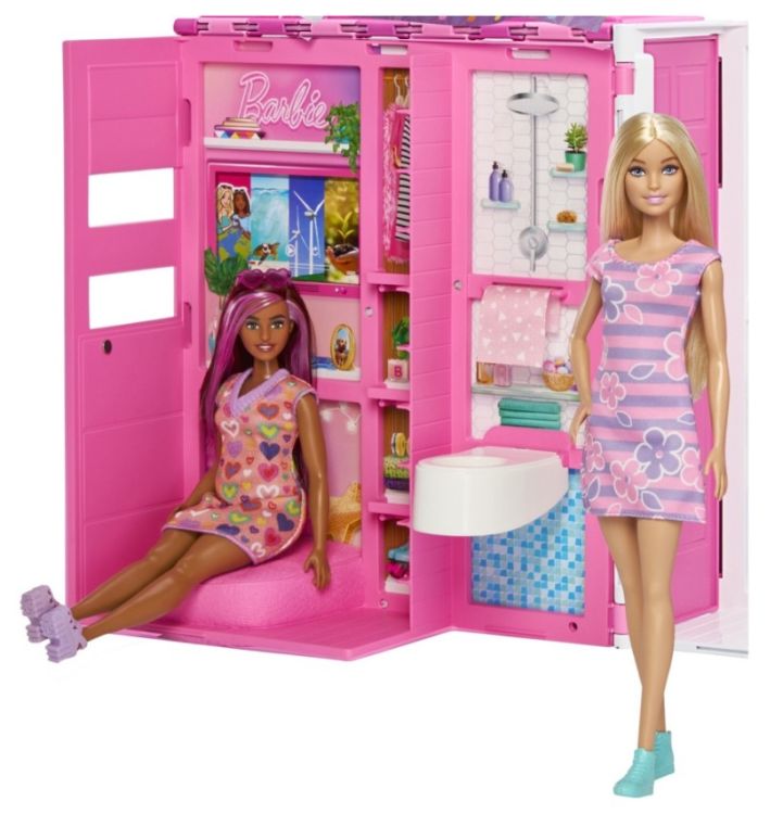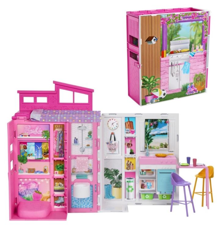 Aceasta casa de papusi Barbie draguta colorata si pliabila inspira o multime de distractie si nenumarate aventuri Exista patru zone de joaca - o bucatarie o baie un dormitor la mansarda si un colt de film -- precum si accesorii fermecatoare pentru decorare. Casa Barbie Getaway este un cadou perfect pentru copiii cu varsta de la 3 ani in sus Copiii isi pot imagina atat de multe povesti dulci cu Barbie Getaway House Vine cu 4 zone de joaca si 11 accesorii pentru ore nesfarsite de distractie. Accesoriile de decor inclusiv vase asortate 2 scaune un prosop si o patura adauga detalii realiste si tot felul de posibilitati de joaca. Grafice precum cosurile de reciclare si compost plantele panourile solare de pe acoperis si un vehicul electric pot ajuta copiii sa constientizeze obiceiurile de viata amp bdquo verzi amp rdquo Casa de papusi are o bucatarie cu o masa glisanta o baie un dormitor la mansarda si un lounge confortabil pentru nopti de film si jocuri Copiii pot colecta o varietate de papusi Barbie si animale de companie pentru a juca povesti de prietenie in casa lor Fiecare se vinde separat in functie de disponibilitate. Include 1 casa de papusi Barbie cu 11 accesorii.