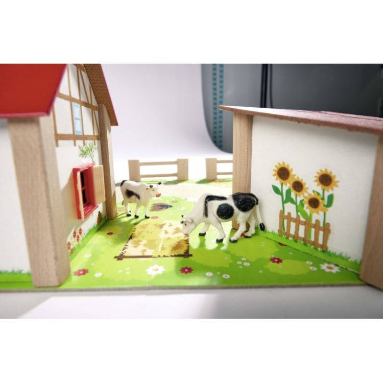 Placa de joaca cu dimensiunea de 36x51 cm creeaza o zona de joaca spatioasa. Fermierul si sotia fermierului locuiesc in ferma iar animalele locuiesc intr-un grajd mare si confortabil. Ferma include gaste vaci porci si cai.Specificatii