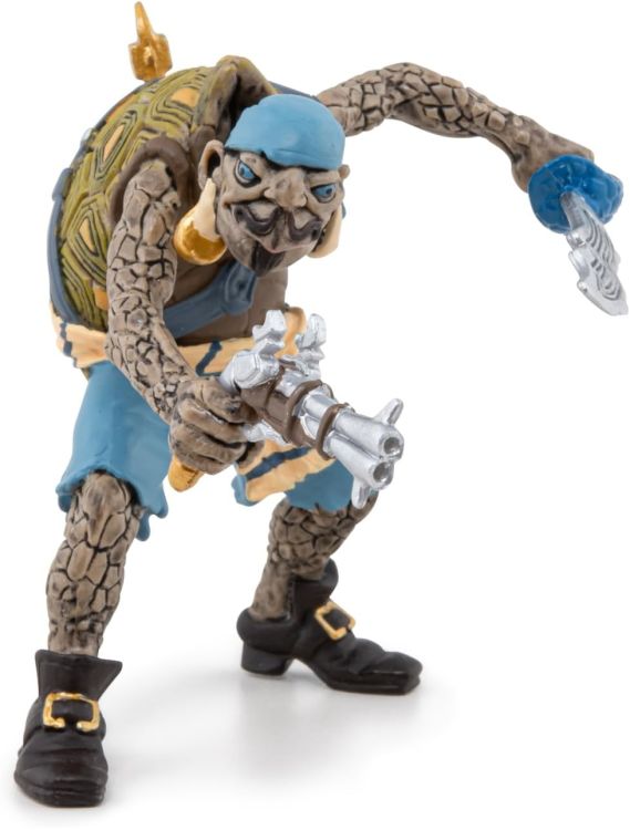 Navigati pe mari in cautarea comorilor pierdute. Figurina pirat testoasa mutant eschipata cu 3 arme. Produsul are urmatoarele dimensiuni 8 x 8. 2 x 11. 5 cm si este recomandat copiilor cu varsta peste 3 ani. De mai bine de 20 de ani Papo inoveaza constant si ii face pe copii din intreaga lume sa viseze cu o gama bogata de peste 600 de produse reprezentand 12 lumi animale si personaje. De la modelul original la serie fiecare dintre figurinele Papo a fost conceputa si creata in Franta pentru a fi fabricata intr-o permanenta preocupare pentru calitate. Pictate manual atentia la detalii este acum recunoscuta. Figurinele Papo se disting prin acuratete si realism detaliile sunt de asa natura incat am putea crede ca se vor pune in miscare.Specificatii
