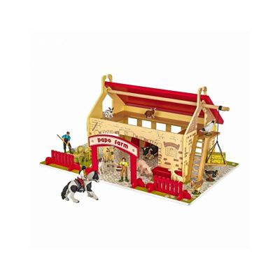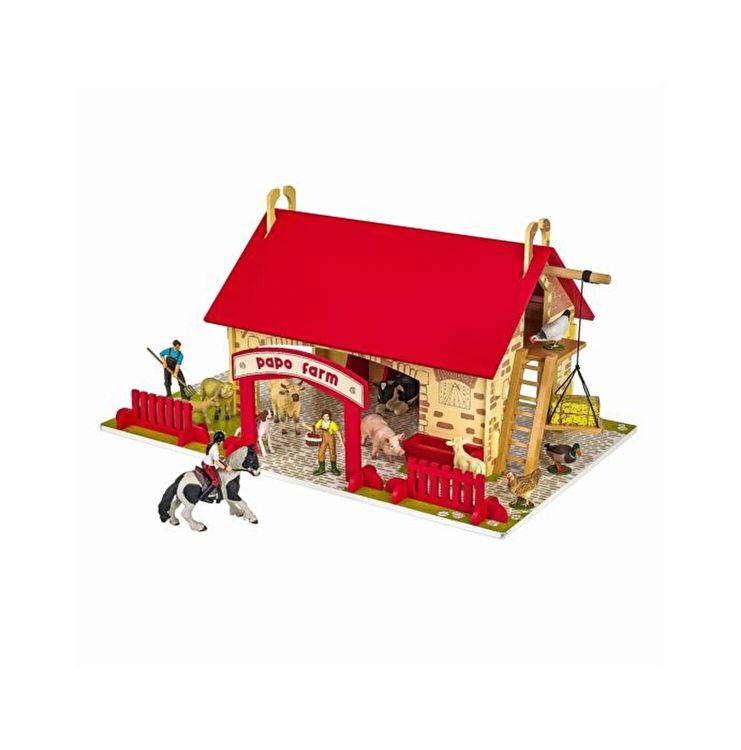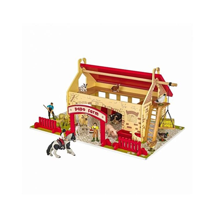 Ferma Papo primeste multe animale si nu lipsesc activitatile. Trebuie sa aveti grija de vaci, sa hraniti porcii, sa umpleti adapatorii si sa nu uitati sa puneti paiele in pod! Ferma Papo are un acoperis detasabil pentru a fi usor de jucat.