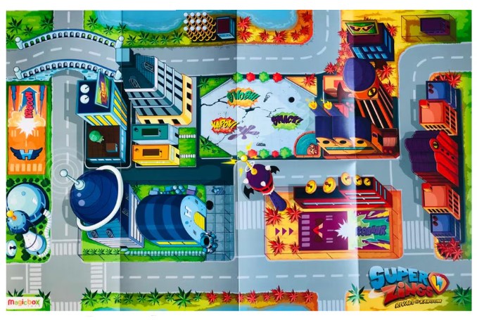 Aventurile tale de joaca se pot petrece acum in orasul Kaboom cu ajutorul celui mai cool poster de colectionat care contine si o harta a orasului. Plaseaza-ti figurinele SuperZings in locatii strategice circula pe strazile din orasul Kaboom cu super sliderul exclusiv inclus sau orice alt vehicul vandut separat si concureaza cu prietenii pentru a vedea cine va iesi castigator. Poti salva orasul Kaboom de raufacatori purtand masca exclusiva. Incepe sa colectionezi seria 3 SuperZings cu acest pachet cu poster masca exclusiva un super slider metalic exclusiv si o figurina SuperZings. Contine 1 poster 1 masca exclusiva 1 super slider metalic exclusiv 1 figurina SuperZings.Specificatii