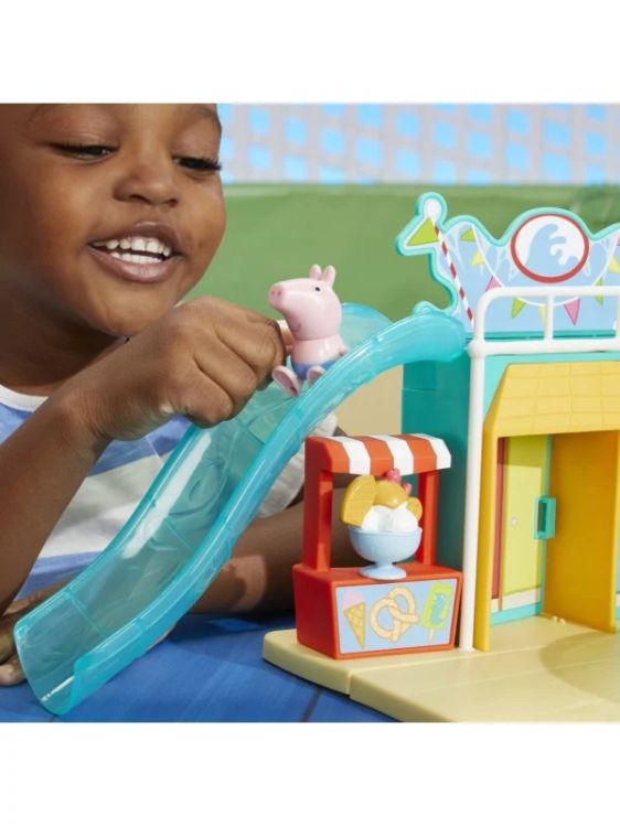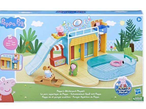 Aluneca spre distractie cu acest set de joaca Parcul acvatic al lui Peppa Copiii isi pot imagina o zi la parcul acvatic cu personajele lor preferate Peppa Pig. Intra in vestiarul setului de joaca si du-te la puntea pentru piscina Urca pana la etajul doi cu liftul in forma de balena apoi zboara pe tobogan cu ajutorul colacului pentru inot in forma de flamingo Fa o baie in piscina apoi prefa-te ca te usuci cu unul dintre prosoape inainte de a lua o inghetata de jucarie de la barul cu gustari Include figurinele George si Peppa care isi poarta costumele de baie astfel incat copiii sa poata recrea scene din serial sau sa isi imagineze propriile aventuri. Aceste jucarii pentru fete si baieti cu varsta de la 3 ani in sus sunt cadouri distractive pentru copiii care iubesc serialul.