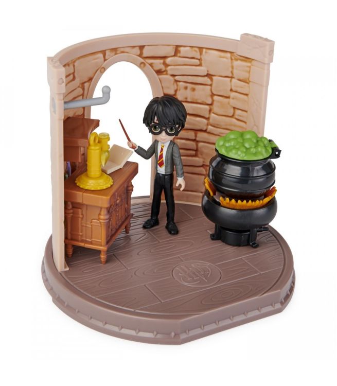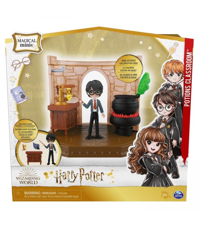 Prefaceti-va ca va exersati prepararea potiunilor cu Harry Potter in sala de clasa de mini-potiuni magice din Wizarding World! Dispunand de o figura exclusiva de 7. 5 inchi Harry Potter si trei accesorii tematice, tinerele vrajitoare, vrajitori si Muggles isi pot recrea scenele preferate din Harry Potter cu acest set de joaca distractiv. Cu copia sa a manualului de preparare avansata a potiunilor al Printului Semisange, Harry poate prepara potiuni, inclusiv norocosul Felix Felicis, in interiorul ceaunului fierbinte. Pozitionati figurina Magical Minis si aprindeti flacarile cazanului mutandu-l pe Harry peste locul de activare - flacarile se ridica si ceaunul se deschide magic! Sala de Potiuni are chiar si un biban pentru Hedwig (nu este inclus) pentru a va observa aventurile fermecatoare. Sala de clasa Magical Minis Potions este modalitatea perfecta de a-ti inspira imaginatia prin joc distractiv si captivant. Conectati setul de joaca la Castelul Magical Minis Hogwarts (vandut separat) si extindeti-va lumea Magical Minis cu setul de joaca Charms Classroom si Care of Magical Creatures (fiecare vandut separat). Colecteaza si conecteaza toate figurinele Magical Minis, seturile de prietenie si seturile de joaca pentru a-ti construi propria lume magica (fiecare vanduta separat)! Jucariile Magical Minis Harry Potter sunt cadourile perfecte pentru copii si fanii Harry Potter. Experimentati magia lui Harry Potter cu sala de clasa cu mini-potiuni magice din Wizarding World!
