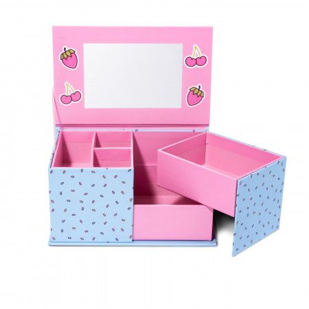 Aceasta cutie de bijuterii din carton este impartita in cinci compartimente si este ideala pentru depozitarea bijuteriilor celor mici. Cu oglinda incorporata Pachetul contine o cutie pentru bijuterii. Martinelia este un brand care face parte din grupul Aquarius Cosmetic SL principalul distribuitor de parfumuri si cosmetice in Spania inca din anul 1995. in ziua de astazi brandul se gaseste in toata lumea nu doar in Spania. Produsele brandului la Martinelia pot fi recunoscute cu usurinta datorita ambalajului unic si jucaus. in oferta brandului Martinelia veti gasi seturi de cadouri accesorii pentru par popularele balsamuri de buze aromate si alte accesorii care vin in ambalaje haioase. Copiii vor fi incantati de produse precum setul decorativ in forma de ursulet peria de par unicorn sau periuta de dinti cu sirene. Martinelia ofera pentru cei mici o gama larga de produse distractive si inovatoare in toate culorile curcubeului. Seturi de machiaj rujuri si tot felul de produse si accesorii concepute pentru a tine pasul cu ultimele tendinte. Produsele sunt sigure si prietenoase cu mediul fiind special proiectate pentru a putea fi folosite de copii.Specificatii