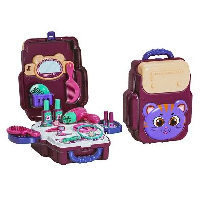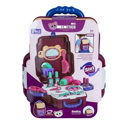Set accesorii frumusete in ghiozdanel din plastic tare usor de transportat fie in mana fie in spate. Jucarie special conceputa pentru a promova dezvoltarea imaginatiei a simturilor si a coordonarii ochi-mana. Caracteristici - Setul contine 24 de piese 1 ghiozdan ce se transforma in suport pentru accesorii 2 x sticle lac de unghii 2 x rujuri 2 agrafe 4 inele 1 pieptene 1 perie 2 x agrafa-pieptene 1 x uscator par perie 2 bratari 2 folii autocolante. - Ghiozdanul se transforma in suport cu ajutorul a 5 piese ce se fixeaza in interiorul lui. - Ghiozdanelul poate fi transportat in mana sau spate cu ajutorul manerului sau a curelelor. - Jucaria este realizata din material plastic si textil. - Copiii vor petrece mult timp jucandu-se cu acest set si vor putea dezvolta o multime de jocuri de rol. Jocurile de rol ii ajuta pe cei mici sa isi dezvolte vocabularul si sa comunice mult mai usor. Indiferent de rolul ales distractia va fi garantata. Avertizare Produsul este nou si comercializat in ambalajul original al producatorului. Imaginile de pe acest site au caracter informativ. Produsul nu functioneaza cu baterii. Ambalajul trebuie indepartat recuperat si aruncat de catre un adult inainte de a se da spre utilizare copilului. Nu lasati ambalajele produselor la indemana copiilor. Se recomanda utilizarea produsului sub supravegherea unui adult. Produsul poate contine piese mici care se pot inghiti sau inhala de cei mici existand pericolul de sufocare sau nu este potrivita copiilor mai mici de 3 ani. Pastrati instructiunile si etichetele pentru referinte viitoare. Pastrati produsul departe de foc si nu il lasati in preajma temperaturilor ridicate si a umiditatii. Datorita masurarii manuale a produsului poate exista o diferenta minora fata de dimensiunea reala a produsului.Specificatii