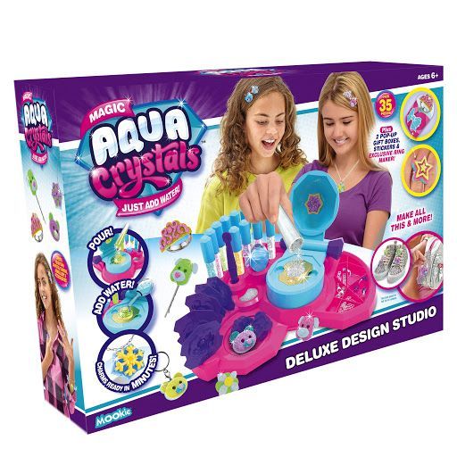 Adaugati apa si realizati creatii incredibile din cristal cu Aqua Crystals Deluxe. Setul de joaca Aqua Crystals include tot ce ai nevoie pentru a realiza inele stralucitoare accesorii pentru par farmece de vis pandantive pentru colier bratari brelocuri si alte creatii magice. Posibilitatile sunt nesfarsite. Pentru a Incepe pur si simplu alegeti materialul si completati cu cristalul magic colorat pentru a crea un design unic apoi adaugati pur si simplu apa si asteptati sa va fie dezvaluite creatiile. Aceste accesorii din cristal spumant sunt ideale pentru a experimenta si accesoriza. Cadoul perfect pentru tine si prietenii tai Potrivit pentru varste de peste 6 ani. Avertisment de siguranta Nu este potrivit pentru copiii sub 3 ani. Pachetul contine 1 aparat Deluxe Aqua Crystal cu matrita si tavita pentru depozitare din plastic 6 tuburi cu cristale de diferite culori 1 saculet cu sclipici 4 matrite pentru pandantive din plastic 1 matrita aurita bonus 1 unealta pentru inele 1 unealta pentru sireturi 1 unealta universala 1 pipeta pentru apa 2 cutiute de cadou 14 abtibilduri accesorii 3 baze pentru inele 2 agrafe de par 1 baza pentru breloc 1 baza pentru accesorii de agatat 1 lantisor cu Inchizatoare 1 bratara cu Inchizatoare instructiuni.Specificatii