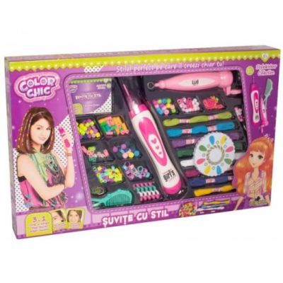 Setul 3 in 1 care te face unica in stilul tau Accesorizeaza-te cu podoabe pe care le creezi chiar tu rapid si simplu folosind aparatul de impletit si aplicatorul de margele 1. Mese rasucite - Creeaza mese din fire rasucite cu aparatul de impletit si prinde-le cu agrafe in parul tau. 2. Suvite cu margele - Insira margelute pe suvitele tale rapid sigur si curat folosind aplicatorul. 3. Bratari impletite Creeaza bratari din fire colorate simple sau cu margele folosind ingeniosul disc de impletit Continut 1 aparat de impletit 1 aplicator de margele 1 disc de impletit 8 fire colorate 1 pieptan elastice de par margele colorate manual de instructiuni.Specificatii
