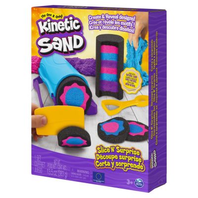 Creeaza si dezvaluie modele incredibile de nisip surpriza cu Setul Kinetic Sand Slice N' Surprise! Acest set Kinetic Sand are tot ce ai nevoie pentru a-ti personaliza surprizele de nisip 115 g fiecare de nisip Kinetic negru, roz si albastru si sapte unelte si matrite! Deschideti setul Slice N' Surprise si descoperiti toate modurile diferite de a juca. Pufa nisipul si umple matrita cilindrului, apoi foloseste instrumentul pentru miez, stele sau cerc pentru a indeparta centrul. Goliti instrumentul de baza si stampilati-l in Nisip Kinetic pentru a stratifica diferite culori. Puneti-l inapoi in interiorul cilindrului si repetati procesul cu celalalt instrument de baza. Umpleti-l cu o singura culoare, amestecati nisip impreuna sau stratificati Nisip Kinetic in interior! Stropeste nisipul cu pistonul si pregateste-te pentru dezvaluirea captivanta! Puteti deschide cilindrul sa va taiati surprizele cu instrumentul de sculptat sau sa continuati sa striviti cu pistonul. Pe masura ce Nisipul Kinetic iese din cilindru, taiati cu cutitul pentru a descoperi modelele voastre unice de nisip! Apoi stratificati, sculptati si feliati din nou si din nou este atat de distractiv! Cu setul Kinetic Sand Slice N' Surprise, exista atat de multe posibilitati creative! Cand ati terminat de jucat, instrumentele se impacheteaza pentru o depozitare compacta. Kinetic Sand este nisipul original de joaca magic, modelabil si fascinant. Mai bun decat argila de modelare pentru arte si mestesuguri, acest nisip senzorial nu se usuca niciodata, asa ca te poti juca cu Kinetic Sand pentru ore intregi de joc independent tactil. Lasa-l sa curga prin mainile tale este atat de satisfacator, incat nu-l vei putea lasa jos! Kinetic Sand este realizat cu nisip natural si este non-toxic si hipoalergenic. Se lipeste magic si se curata usor. Jucariile pentru copii Kinetic Sand pentru baieti si fete de 3 ani sunt cadoul perfect pentru copii. Personalizati-va propriile efecte de nisip surpriza cu setul Kinetic Sand Slice N' Surprise!