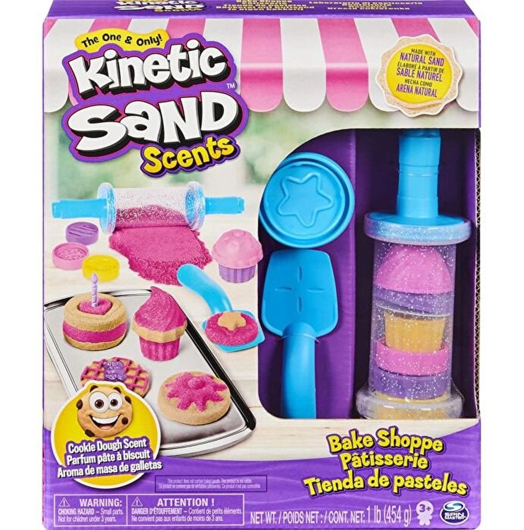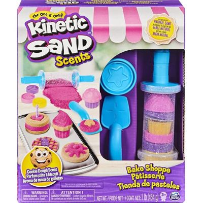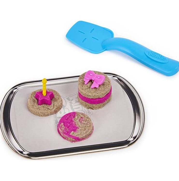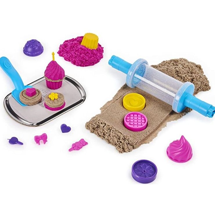 Doua tipuri de nisip Kinetic, unul cu parfum si 16 accesorii de copt, le permit copiilor sa se cufunde adanc in jocurile de rol cu acest set de panificatie. Kinetic Sand este intins cu sucitorul stralucitor, iar apoi poate fi taiat in forme de biscuiti cu formele incluse. Cutiile creeaza cupcakes dragute care pot fi decorate cu accesorii si stampile mici. Un ridicator, o tava de servire si un ambalaj ca fundal ofera un joc de rol imaginativ in care parintilor le va placea sa fie implicati. Accesoriile mici pot fi depozitate in sucitor.