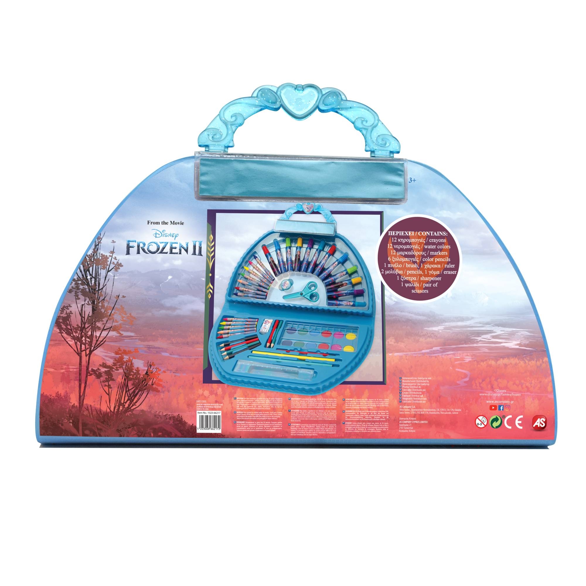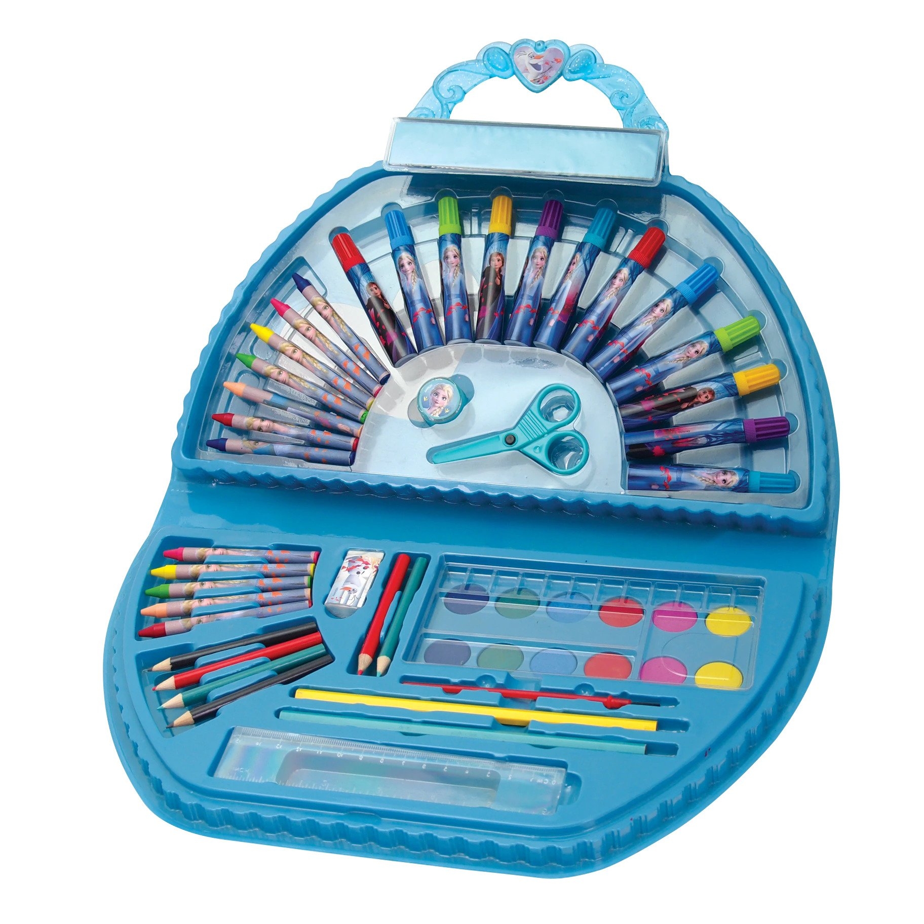 Setul de desen ART CASE ajuta copiii sa ia setul de colorat peste tot, pentru a putea desena, colora si picta oriunde ar fi. Acesta include 12 creioane cerate, 12 acuarele, 12 marcatori, 6 creioane colorate, 1 perie, 1 rigla, 2 creioane, 1 radiera, 1 ascutitoare, 1 pereche de foarfece cu Frozen II.