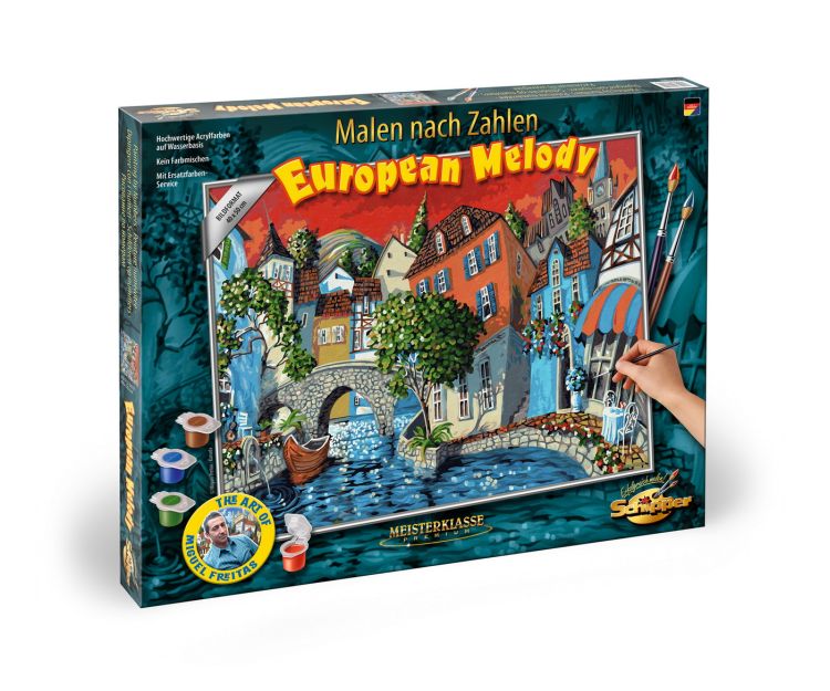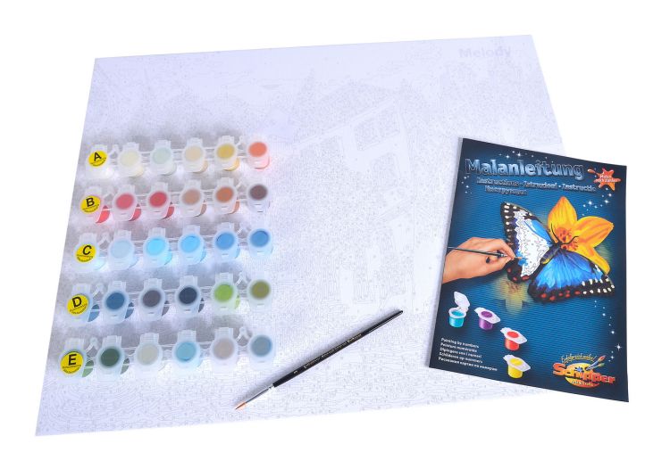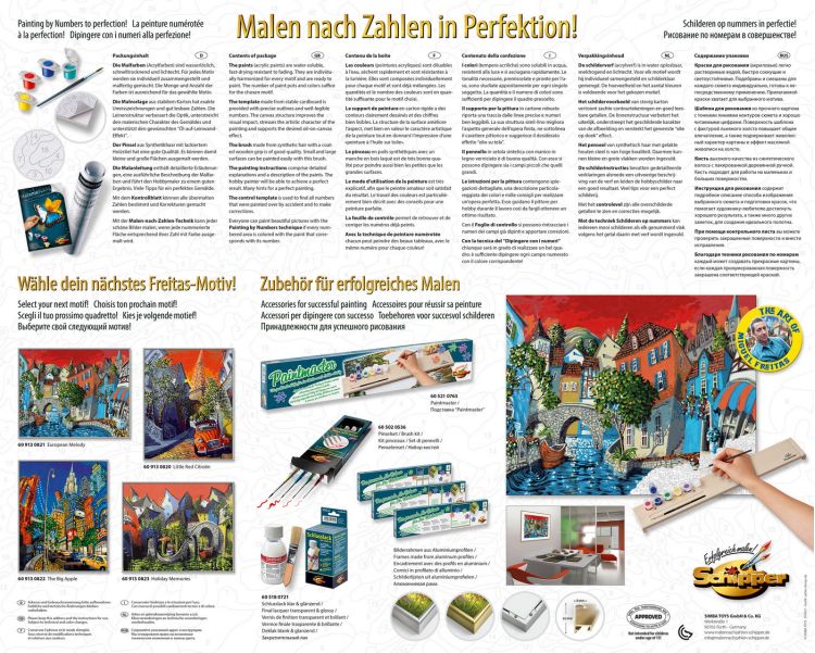 Acest set de pictura pe numere are o dimensiune 40x50 cm si este din carton cu textura din panza, cu desen conturat in numere. Culorile si pensula sunt incluse. Culorile acrilice des utilizate in realizarea picturilor artistice ce nu necesita amestecare cu apa, culorile se gasesc in tuburi de plastic ce au atasate numere corespunzatoare conturului desenat pe panza, tabloul se poate agata ulterior pe perete. Fiecare zona este marcata cu numere ce corespund unei anumite culori. Completati fiecare zona si in cele din urma imaginea va aparea ca un tablou finit. "Picturi pe Numere" este primul pas perfect pentru incepatori, pentru ca si acestia sa se bucure de pictura. Pictura odata terminata se poate pune in rama. Ramele nu sunt incluse in set. Ele se pot achizitiona, optional si separat. Produsul este comercializat sub brandul german Schipper fiind fabricat la inalte standarde de calitate, in Germania.