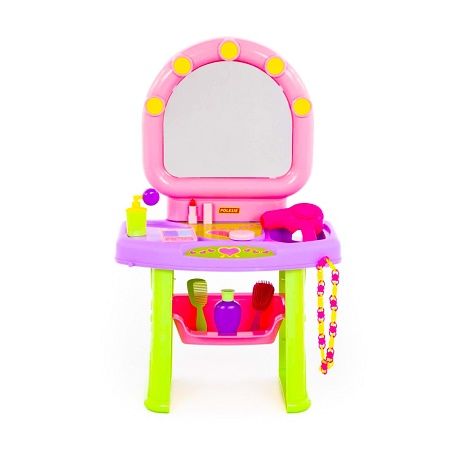 Seturile de frumusete reprezinta jucarii care sunt un hit constant pentru toate fetele. Mesele de toaleta pline cu erse accesorii le permit fetitelor mai mici sa-si imite surorile mai mari prietenele si mamele. Aceste seturi fac mai usor rolul unui mic make-up artist sau al unui fotomodel si inspira jocuri pline de imaginatie. Consideram ca este o idee grozava de cadou pentru fetele carora le plac articole din pungile cosmetice destinate adultilor deoarece imitatiile incluse in set sunt concepute cu gandul la copii non-toxice si sigure. Caracteristici - Fetele devin din ce in ce mai interesate sa se infrumuseteze folosind bijuterii sau machiaj. Daca fetita ta te convinge sa-i cumperi produse cosmetice sau erse decoratiuni ii poti oferi aceasta mini masa de toaleta cu oglinda si raft care ofera super distractie. - Oglinda este absolut sigura deoarece este realizata din plastic nu din sticla. - Pentru depozitarea comoda a accesoriilor exista un raft incapator. - Setul include urmatoarele accesorii uscator de par 2 piepteni colier cutie de pudra fard de ochi ruj 2 sticle pentru parfum. - Cu acest set o mica fashionista va putea sa-si organizeze propriul salon de infrumusetare si sa incerce rolul unui coafeze make-up artist sau stilist. - Jucaria este realizata din plastic de cea mai inalta calitate cu atentie la cele mai mici detalii ceea ce garanteaza atat siguranta cat si confortul in utilizare. - De acum inainte fetitele cochete se vor aranja cu placere. In timpul jocului li se dezvolta abilitatile motorice fine simtul lor de frumusete si comunicarea iar cu ajutorul ceasului vor invata notiuni despre timp. - Ambalaj cutie. Dimensiuni masa de toaleta 40. 5 26. 5 64. 5 cm Avertizare Aceasta jucarie contine piese mici. In cazul putin probabil al inghitirii unor astfel de piese consultati de urgenta un specialist. Produsul este nou si comercializat in ambalajul original al producatorului. Imaginile de pe site au caracter informativ. Ambalajul trebuie indepartat recuperat si aruncat de catre un adult inainte de a se da spre utilizare copilului. Nu lasati ambalajele produselor la indemana copiilor. Se recomanda utilizarea produsului sub supravegherea unui adult. Produsul poate contine piese mici care se pot inghiti sau inhala de cei mici existand pericolul de sufocare sau nu este potrivita copiilor mai mici de 3 ani. Pastrati instructiunile si etichetele pentru referinte viitoare. Pastrati produsul departe de foc si nu il lasati in preajma temperaturilor ridicate si a umiditatii. Datorita masurarii manuale a produsului poate exista o diferenta minora fata de dimensiunea reala a produsului.Specificatii