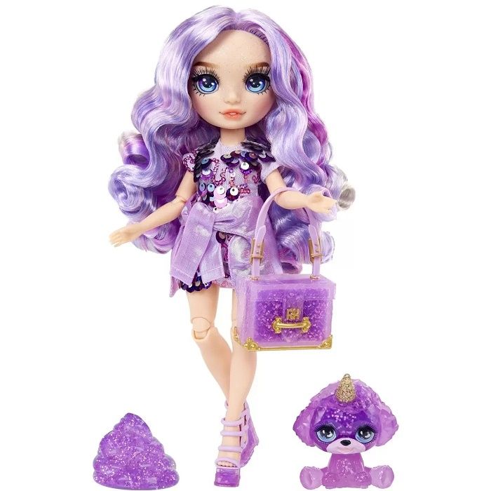 Rainbow High inspira copiii sa fie creativi. Curcubeul straluceste puternic la fel si noile papusi Classic Rainbow Descopera si joaca-te cu Violet Willow intr-un nou mod fantastic Acum cu Liquid Rainbow Slime exista mai multa culoare mai multa stralucire mai multe modalitati de joaca Si pentru prima data papusa ta preferata vine cu propriul animal de companie care de asemenea straluceste Violet Willow este articulata pentru scenarii de joaca nelimitate si pline de farmec Vine cu o tinuta completa inclusa si accesorii. Violet este imbracata din cap pana in picioare in mov Pentru prima data Violet are adorabilul ei animal de companie magic cu corn - Periwrinkle. Pentru a schimba culoarea animalutului ii poti umple corpul cu slime. Violet Willow vine cu pantofi draguti si o geanta pe care le poti personaliza si carora le poti schimba culoarea adaugand niste slime. Are trasaturi superbe si detaliate si par frumos Include o papusa cu tinuta completa pantofi geanta animal de companie slime si sclipici. Colectioneaza toate papusile Rainbow High din gama Classic Rainbow si vei avea toate culorile curcubeului Fiecare papusa are propriul stil care ii exprima perfect personalitatea. De asemenea fiecare papusa vine cu culoarea de slime asortata rosu portocaliu galben verde albastru violet sau roz. Exista o multime de moduri de a-ti imagina o joaca distractiva si creativa cu aceste papusi Imbraca-le in fiecare look iar daca ai doua sau mai multe papusi din gama Classic Rainbow le poti schimba si asorta piesele vestimentare intre eleSpecificatii