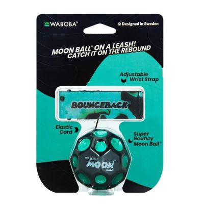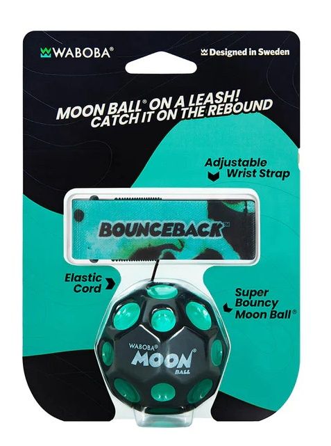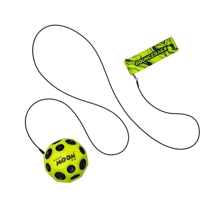 Bounceback are o minge Moon ball atasata la o curea pe care o porti la încheietura, reglabila. Pur si simplu arunc-o in fata ta, astfel incat sa ricoseze, si prinde-o cand revine!