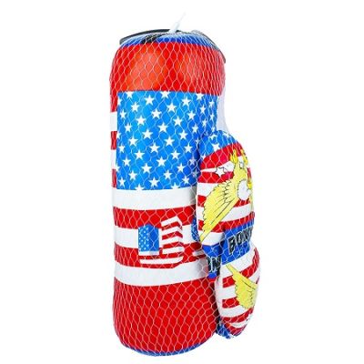 Sacul de box cu manusi este o jucarie potrivita pentru copii carora le place sportul care au multa energie si isi doresc sa aibe o conditie fizica buna. Jocul cu acesta incurajeaza miscarea si dezvolta motricitatea. Caracteristici - Sacul de box este confectonat din PVC la exterior si material textil la interior non-toxice ceea ce face ca jocul sa se desfasoare in siguranta. - Sacul este insotit de o pereche de manusi din PVC la exterior cu protectie interioara din melana sintetica si prindere cu scai. - Produsul are imprimeuri cu doua din cele mai importante simboluri americane steagul si vulturul. - Sacul are in partea superioara doua manere pentru agatare din material textil rezistent. - De asemenea invelitoarea sacului de box este prevazuta cu fermoar. - Jucaria ajuta la cresterea conditiei fizice si a rezistentei la efort la cresterea atentiei si a concentrarii. - Produsul este ambalat in plasa. Dimensiuni sac de box 52x16x16 cm Lungime manusi exterioara - 23 cm interioara - 18 cm Avertizare Produsul este nou si comercializat in ambalajul original al producatorului. Imaginile de pe site au caracter informativ. Ambalajul trebuie indepartat recuperat si aruncat de catre un adult inainte de a se da spre utilizare copilului. Nu lasati ambalajele produselor la indemana copiilor. Se recomanda utilizarea produsului sub supravegherea unui adult. Produsul poate contine piese mici care se pot inghiti sau inhala de cei mici existand pericolul de sufocare sau nu este potrivita copiilor mai mici de 3 ani. Pastrati instructiunile si etichetele pentru referinte viitoare. Pastrati produsul departe de foc si nu il lasati in preajma temperaturilor ridicate si a umiditatii. Datorita masurarii manuale a produsului poate exista o diferenta minora fata de dimensiunea reala a produsului.Specificatii