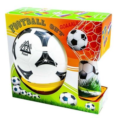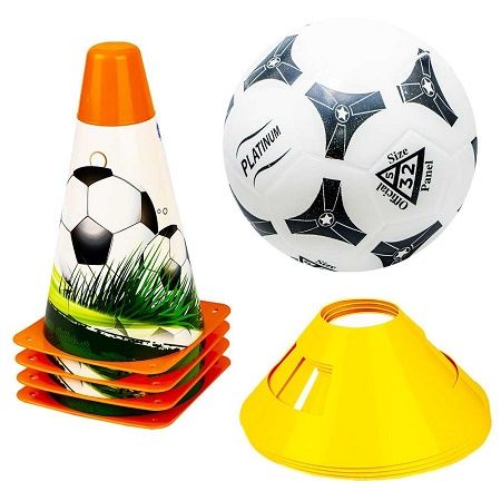 Antrenati-va cu acest set in sala sau pe gazon petrecand un timp distractiv plin de beneficii. Caracteristici - Setul contine 1 minge 4 jaloane si 4 conuri. - Jaloanele sunt viu colorate cu imprimeuri specifice jocului de fotbal. - Fiecare jalon are 4 perforatii in colturile bazei daca se doreste fixarea acestora cu tarusi nu sunt inclusi . - Mingea este fabricata din PVC si are model minge de fotbal. - Conurile au decupaje. - Setul este destinat copiiilor care doresc sa se puna in forma si sa obtina un avantaj competitiv in fotbal alergare tenis handbal volei sau orice sport de echipa care necesita viteza picioare rapide si vigilenta. - Jucaria ajuta la intarirea articulatiilor si imbunatateste echilibrul si mobilitatea. De asemenea dezvolta coordonarea in timp ce va focalizati pe fiecare miscare. - Jucaria este realizata din plastic de calitate non-toxic. - Ambalaj plasa. Diametru minge 23 cm Dimensiune jalon 10x10x17 cm Dimensiune con 17. 2x17. 2x7 cm Avertizare Produsul este nou si comercializat in ambalajul original al producatorului. Imaginile de pe site au caracter informativ. Ambalajul trebuie indepartat recuperat si aruncat de catre un adult inainte de a se da spre utilizare copilului. Nu lasati ambalajele produselor la indemana copiilor. Se recomanda utilizarea produsului sub supravegherea unui adult. Produsul poate contine piese mici care se pot inghiti sau inhala de cei mici existand pericolul de sufocare sau nu este potrivita copiilor mai mici de 3 ani. Pastrati instructiunile si etichetele pentru referinte viitoare. Pastrati produsul departe de foc si nu il lasati in preajma temperaturilor ridicate si a umiditatii. Datorita masurarii manuale a produsului poate exista o diferenta minora fata de dimensiunea reala a produsului.Specificatii