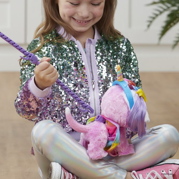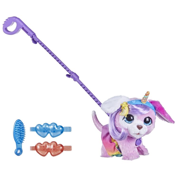 Ce poate fi mai distractiv decat sa plimbi un animal de companie? Plimbarea unui animal de companie pe care l-ai ingrijit si accesorizat chiar tu! Ofera acestui catel un look nou, la moda cu accesoriile incluse si fixeaza-i lesa pentru a-l plimba. Va scoate o multime de sunete de fericire! Bucura-te de aceasta experienta unica de a inventa lookuri noi pentru catelul tau dragalas; poti sa il aranjezi sa arata precum un unicorn! Fie ca va distrati acasa sau mergeti la plimbare prin oras, este clar ca va veti distra de minune in mod elegant!