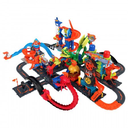 Faceti o plimbare prin parcarea Hot Wheels City dar aveti grija de rechinul periculos care ataca si mananca vehicule Luati liftul pana sus apoi eliberati masina la fiecare nivel unde exista trei activatori care declanseaza aleatoriu rechinul sa strapunga si sa devoreze masina. Evadeaza pana la capat iar rechinul este blocat in cusca deschizand pista pentru a conduce fara atacuri. Un vehicul Hot Wheels este inclus dar exista loc de parcare pentru mai multe masini. Vehicule suplimentare vandute separat. Conectati-l la alte seturi si piese de senile Hot Wheels pentru a construi un peisaj urban unic. Culorile si decoratiunile pot varia.Specificatii