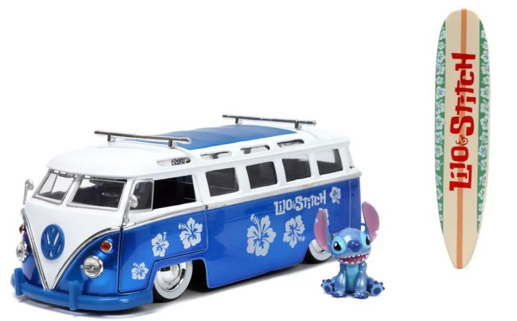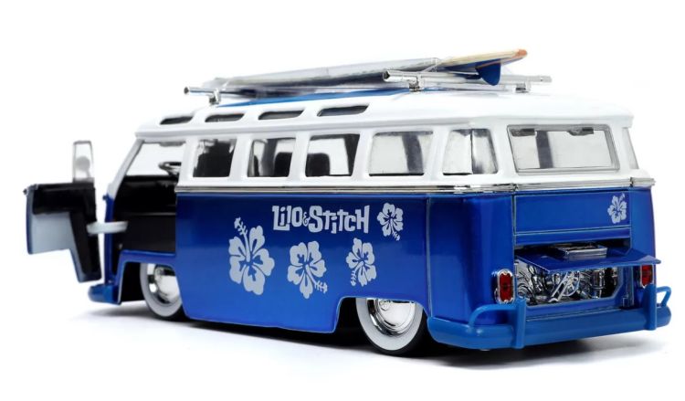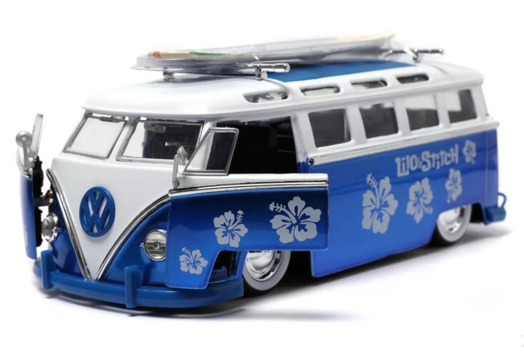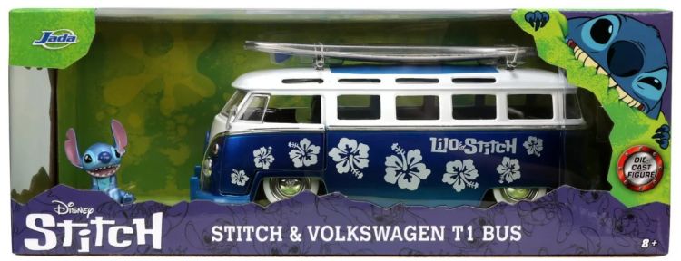 Autobus din metal Volkswagen T1 cu usi mobile si figurina Stitch din metal. Asigurati-va ca niciun Ohana nu este lasat in urma cu Stitch si autobuzul sau Volkswagen T1. Aceast autobuz are o caroserie turnata sub presiune anvelope din cauciuc usa care se deschide si compartimentul pentru motor si placa de surf detasabila cu stil direct inspirat de Lilo amp Stitch de la Disney. De asemenea este inclusa o figurina de colectie Stitch turnata sub presiune de 3. 5 cm.Specificatii