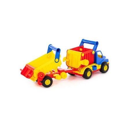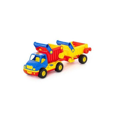 Datorita echipamentului cu elemente mobile jocul cu autobasculanta este foarte interesant atat acasa cat si la aer curat. Caracteristici - Basculanta este confectionata din material plastic robust. - Stimuleaza imaginatia micilor constructori dar si gandirea spatiala cat si jocurile de rol. - Bena camionului cat si cea a remorcii sunt basculabile dar dispun si de un opritor care impiedica bascularea neintentionata. - Benele dispun si de o usa batanta cu opritoare pe ambele parti. - Manerul robust din partea superioara a basculantei poate fi folosit atat pentru transportarea facila a masinii cat si pentru bascularea benei. - Remorca se ataseaza camionului prin carligul special conceput pentru acest lucru. - Rotile sunt din cauciuc moale amortizeaza socurile mai usor. - Dimensiuni masina Lxlxh 50x14x19 cm. - Nerecomandat copiilor cu varsta sub 3 ani. - Ambalaj plasa. Avertizare Produsul este nou si comercializat in ambalajul original al producatorului. Imaginile de pe acest site au caracter informativ. Produsul nu functioneaza cu baterii. Ambalajul trebuie indepartat recuperat si aruncat de catre un adult inainte de a se da spre utilizare copilului. Nu lasati ambalajele produselor la indemana copiilor. Se recomanda utilizarea produsului sub supravegherea unui adult. Produsul poate contine piese mici care se pot inghiti sau inhala de cei mici existand pericolul de sufocare sau nu este potrivita copiilor mai mici de 3 ani. Pastrati instructiunile si etichetele pentru referinte viitoare. Pastrati produsul departe de foc si nu il lasati in preajma temperaturilor ridicate si a umiditatii. Datorita masurarii manuale a produsului poate exista o diferenta minora fata de dimensiunea reala a produsului. Nerecomandat copiilor cu varsta mai mica de 3 aniSpecificatii