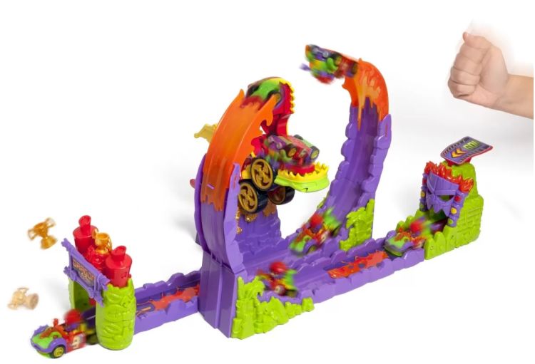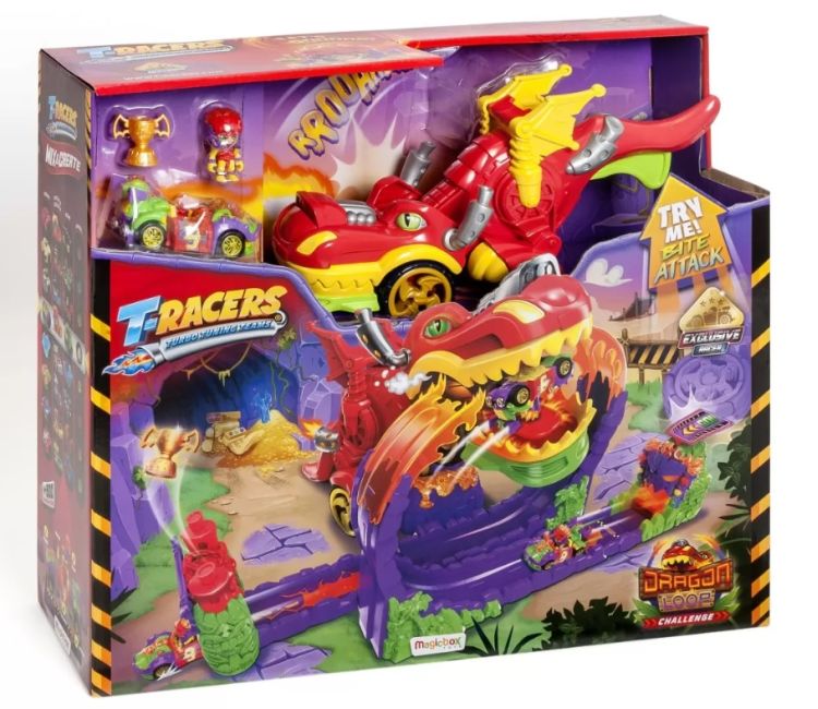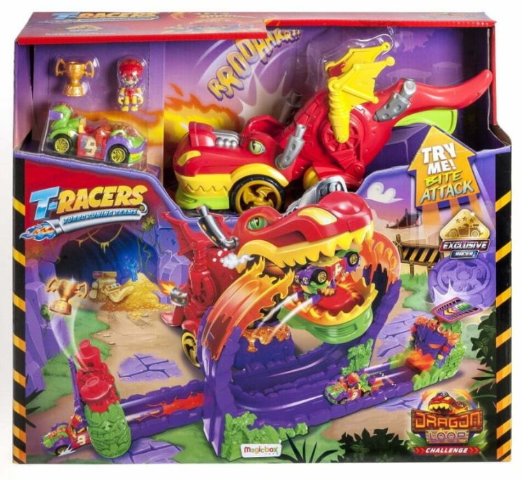 Atentie piloti T-Racers va prezentam cea mai periculoasa cursa din orasul Turbo City Cursa Dragonului Marele dragon este pregatit pentru a inghiti orice pilot care vrea sa treaca pe pista sa Oare vei sfarsi intre falcile sale sau vei reusi sa iesi victorios Totul depinde de tine Fixeaza masina in lansator si ajusteaza viteza pentru Tiki Twist T-Racerul exclusiv pe care il gasesti doar in acest set de joaca puternicul dragon este gata sa te opreasca oare vei reusi sa treci prin bucla victoriei si sa castigi cupa castigatorilor Daca nu iti calculezi forta cu precizie vei fi prins intre dintii lui infioratori Daca vei reusi sa scapi Dragonul va face orice ii sta in putinta pentru a-l impiedica pe incredibilul T-Racer exclusiv sa treaca prin bucla gigantica - se va transforma intr-un vehicul cu roti si va incerca sa te manance Vei reusi sa iesi victorios Demonstreaza ca esti cel mai bun sofer din T-Racers cu setul de joaca Cursa Dragonului Setul de joaca include 1 dragon 1 bucla 1 trofeu 1 T-Racer exclusiv pilot vehicul .Specificatii