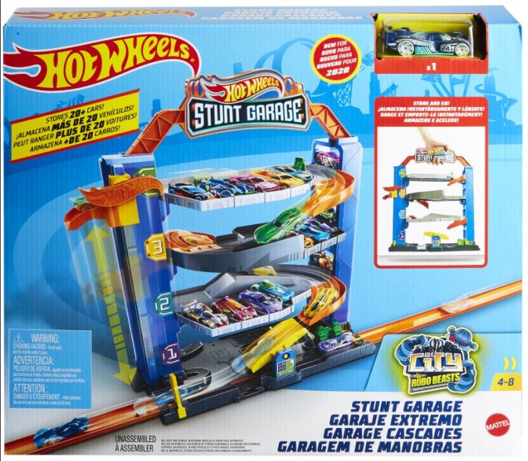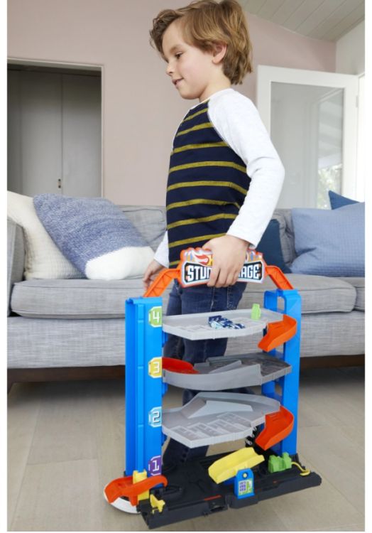 Garajul de la Hot Wheels are dimensiuni generoase si ofera o multime de posibilitati de joaca. Utilizati liftul pentru a aduce masinile la orice nivel vreti sa parcati sau mergeti la un etaj inferior printr-un singur salt. Garajul poate depozita peste 20 de masinute. Cei mici pot face o vizita la service sau la benzinarie pentru a fi pregatiti de urmatoarea aventura. Garajul cu cascadorii Hot Wheels are un maner astfel incat e foarte usor de strans si transportat. Setul de joaca Garajul cu cascadorii se poate conecta cu alte seturi si piste Hot Wheels. Setul include 1 masinuta Hot Wheels 1 la 64.Specificatii