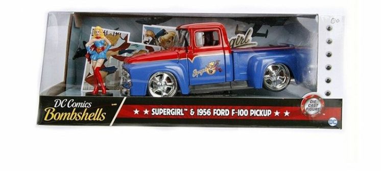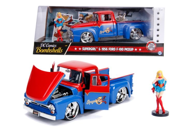 Masinuta de metal, Ford F- 100 Pickup, model 1956, freewheel, usile si capota se pot deschide. Masina este construita la o scara de 1: 24. Setul include si o figurina de metal Supergirl, 7 cm