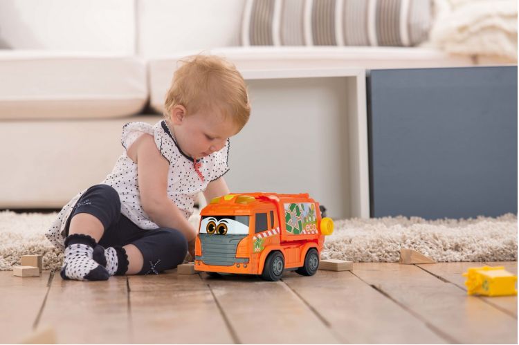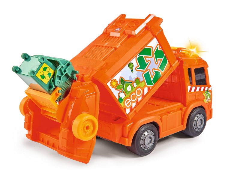 Masina de gunoi motorizata, se poate deplasa inainte/inapoi, cu sunet si lumini si parti mobile. Lungime 25 cm. Motorizat pentru a merge inainte si inapoi. Remorca poate fi intoarsa. Ridicati si coborati recipientul de gunoi inclus.