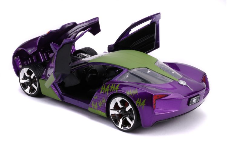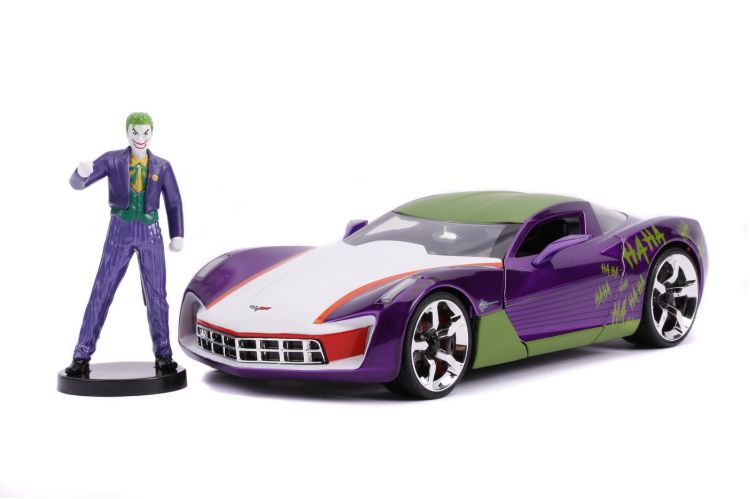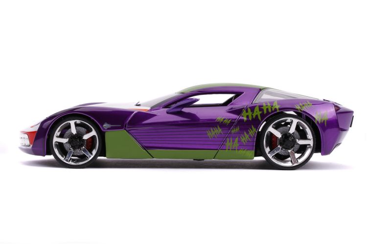 Masinuta din metal Chevy Corvette Stingray, cu usi, capota si portbagaj ce se pot deschide. Setul include si o figurina din metal Joker. Scara 1: 24. Jokerul este un personaj negativ din DC Comics si cel mai rau dusman al lui Batman. Jada a decis sa creeze un model cool si elegant al masinii care sa completeze imaginea sa nebuna. si anume: Chevrolet Corvette Stingray din 2009 a fost ales intr-o combinatie de culori stralucitoare, violet metalic si verde, iar grila radiatorului a fost completata de zambetul lui Joker. Masina este fabricata prin tehnologia Die-Cast (turnare prin injectie). Are detalii atente. Interiorul si exteriorul replica completa a unei masini reale. In set veti gasi o figura unica a Jokerului, care este realizata si prin tehnologia Die-Cast. Acest set va fi un cadou minunat pentru fanii benzilor desenate si ale filmelor.