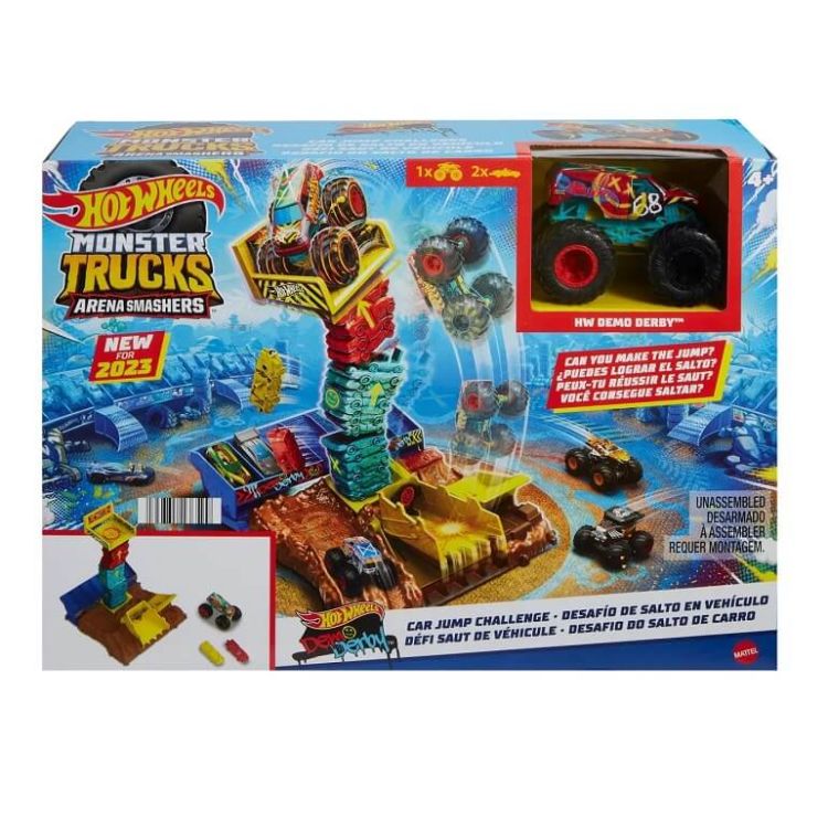 Copiii pot simti puterea de a se prabusi cu un set de joaca Hot Wheels Monster Trucks Arena Smashers Semifinale. Baza fiecarui set se misca si se agita creand feedback senzorial pe masura ce camioanele ating locurile de neuitat desemnate iar copiii exploreaza peisajul. Fiecare set include un Hot Wheels Monster Truck si doua masini zdrobibile si se poate conecta la alte seturi pentru a construi o arena epica Monster Trucks. Fiecare se vinde separat in functie de disponibilitate. Culorile si decoratiunile pot varia. Acest set contine provocarea saritura cu masina.Specificatii