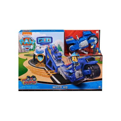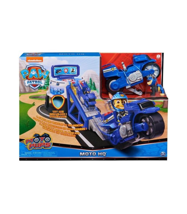 Lanseaza Motocicleta si pleaca alturi de Chase in misiunea de salvare. Cu sunete si o rampa de lansare dedicata motociletei, acest set arata la fel ca sediul de actiune al Patrulei Catelusilor. Urcati-l pe Chase in centrul de comanda si apasati butonul insigna pentru a auzi misiunea. Setul contine 1 centru de comanda Moto HQ (necesita asamblare de catre un adult), 1 figurina Chase, 1 motocicleta Moto Pups, instructiuni.