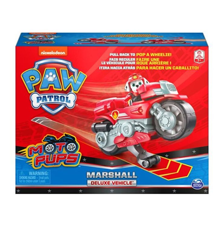 Accelerati, acum este timpul pentru misiuni de salvare cu Marshall si vehiculul lui Paw Patrol. Motocicleta unica are detalii autentice, roti mari si o functie de tractiune care ii permite sa circule pe roata din spate. Purtand o casca si o jacheta de motocicleta, Marshall este gata sa inceapa aventuri incitante. Cand a venit timpul pentru o misiune rapida, asezati-l pe Marshall pe scaunul soferului, apoi trageti motocicleta inapoi pe podea si lasati-o sa vedeti cum accelereaza! Pachetul contine o figura Marshall si un vehicul Marshall.