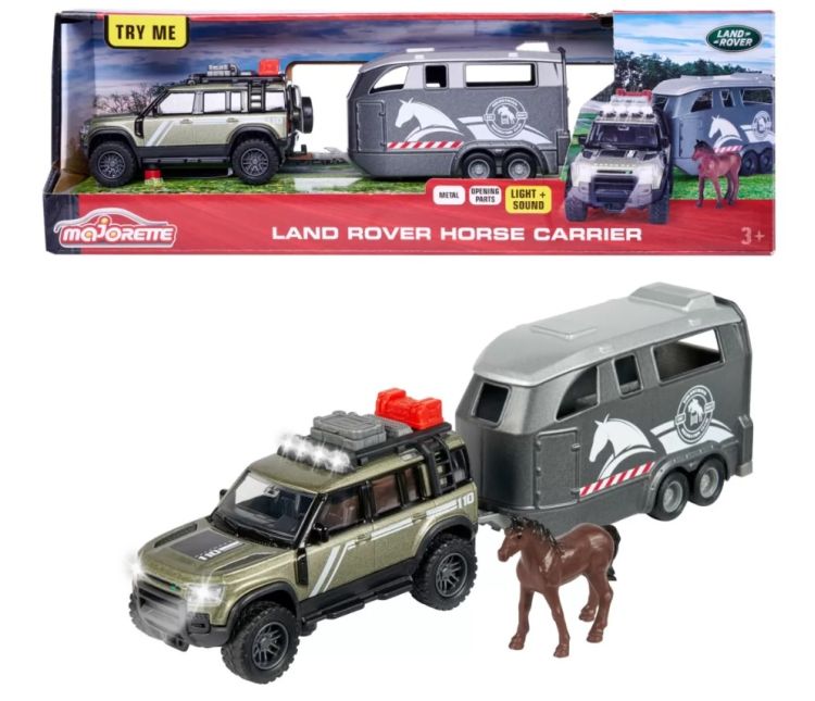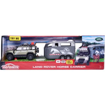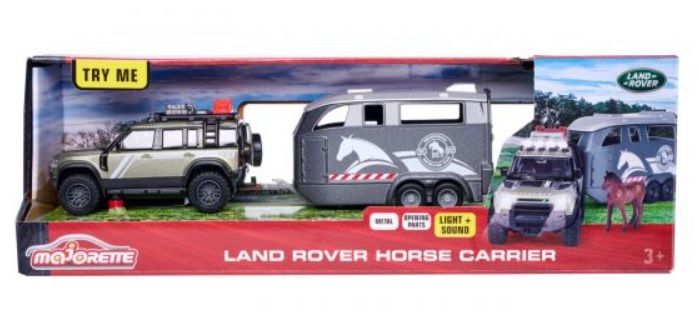Majorette - Land Rover Defender cu remorca pentru cai combinatie premium vehicul remorca cu cal de jucarie efecte luminoase si sonore numeroase functii pentru colectionari si copii cu varsta peste 3 ani. Majorette Land Rover Defender Horse Carrier Pregateste-te pentru urmatorul turneu Dispunand de o remorca pentru cai sic acest model Land Rover are tot ce aveti nevoie pentru a transporta caii in siguranta. Cadoul perfect pentru toti fanii de masini si cai Pe langa un design complex modelul de vehicul Majorette vine si cu mai multe functii practice care sunt garantate pentru a distra copiii mici inclusiv doua efecte sonore diferite doua faruri si o lumina incorporata pe portbagaj care poate fi comutata. porniti si opriti dupa cum doriti. Cutia de acoperis poate fi deschisa pentru a dezvalui doua recipiente un suport de tractiune o scara si o cutie de depozitare. Usa din spate poate fi deschisa si pentru a accesa roata de rezerva in caz de urgenta. Remorca pentru cai este fabricata din metal si are o rampa de plastic pliabila pentru incarcarea si descarcarea calului. Baterii necesare 2Specificatii