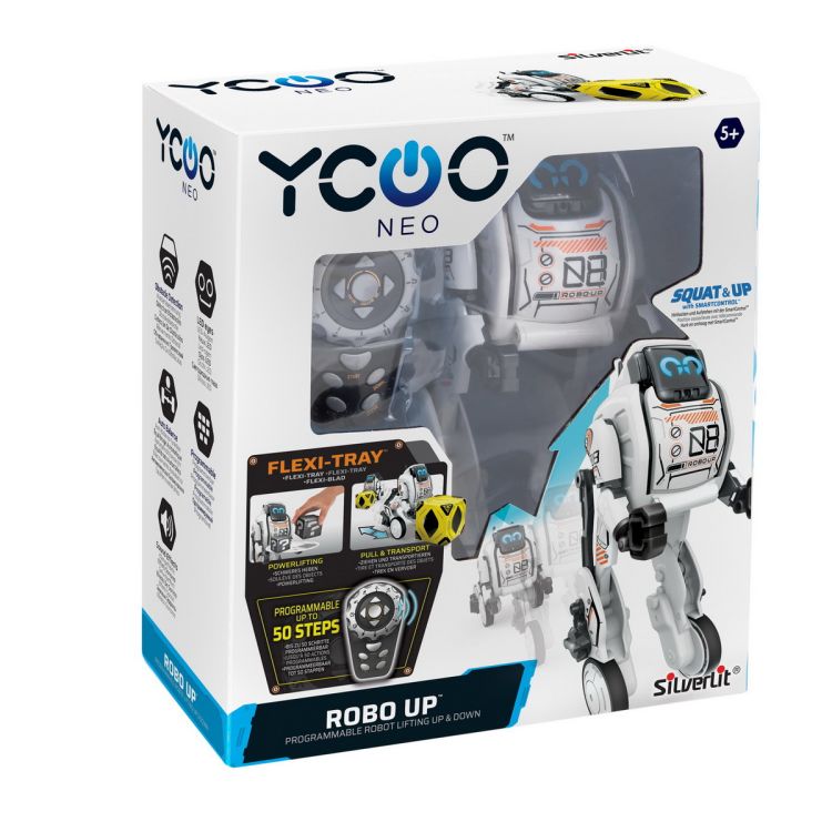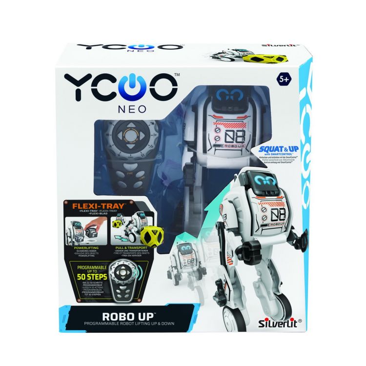 Robotel cu telecomanda ROBO UP este un robotel inteligent care poate transporta lucrusoarele de mici dimensiuni! Asamblat cu un sistem de balansare automata, robotelul poate executa pana la 50 de pasi, detecteaza obstacolele, usor de controlat si manevrat. Ochii robotelului au luminite LED si emite efecte sonore. Se poate ridica siaseza prin apasarea unui buton. Robo up este dotat cu o tavita FLEX TRAY pentru a putea transporta obiecte. Caracteristicile produsului: Balansare automata, transportarea obiectelor, suspensia obiectelor, genunchi articulati. Setul include: 1 robotel robo Up, 1 telecomanda, 1 tavitacu carlig. Functioneaza cu baterii: 4xAA nu sunt incluse (robot), 2xAA nu sunt incluse (telecomanda).