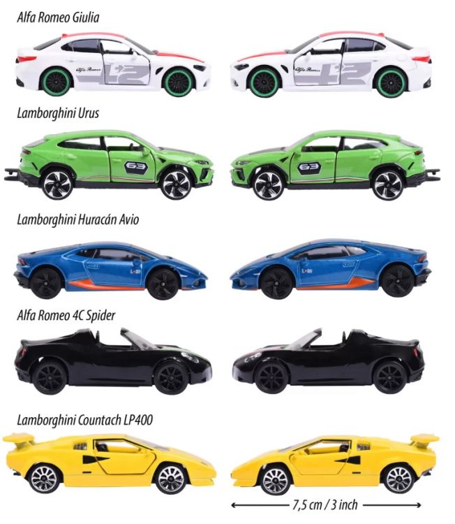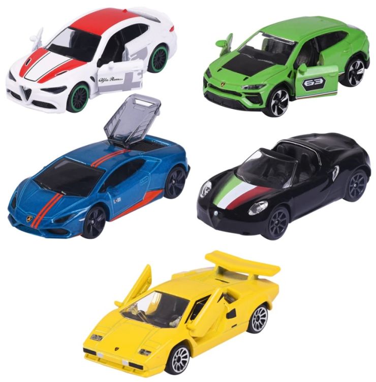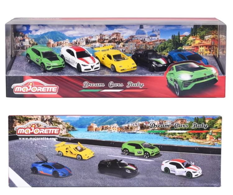 Set 5 masinute din metal Dreams Italy lungime 7. 5 cm. Majorette - Dream Cars Italy - 5 masini italiene de jucarie ca set cadou modele de masini pentru colectionari sau copii de la 3 ani. Setul cadou Dream Cars Italy contine cinci masini de vis italiene realiste si de inalta calitate Alfa Romeo 4C Spider Lamborghini Countach LP 400 Lamborghini Huracan Avio Lamborghini Urus si Alfa Romeo Giulia.Specificatii