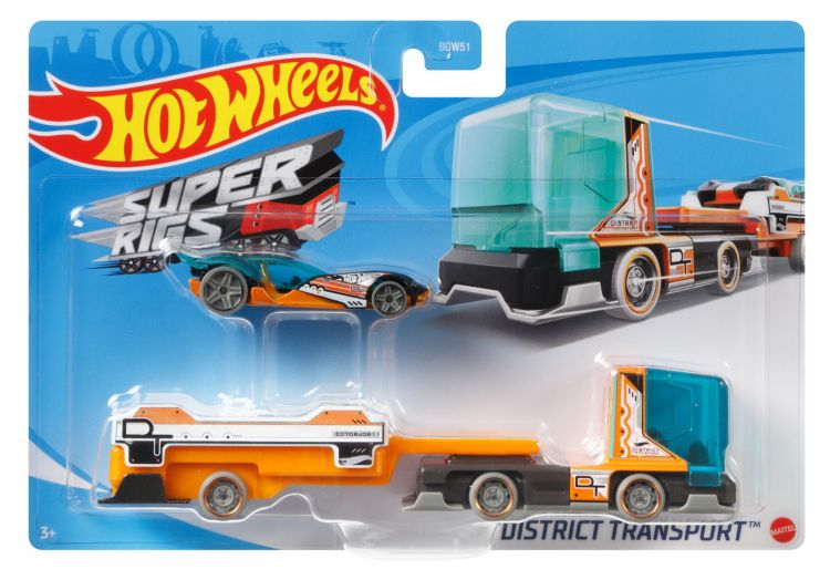Aceste seturi de camioane Hot Wheels cu masini ofera moduri de inspiratie pentru a va juca, impingeti, incarcati si trageti pe pista pentru a va distra! Fiecare platforma vine cu o masina sport si distractie de actiune mare si detalii dinamice. Exista multe modele cu design deosebit la alegere, deci alegeti-l pe cel preferat de voi, apoi incarcati-va si atingeti drumul pentru noi aventuri puternice! Fiecare se vinde separat, in functie de disponibilitate. In acest pachet este inclusa platforma cu masina sport, cu tematica District Transport.