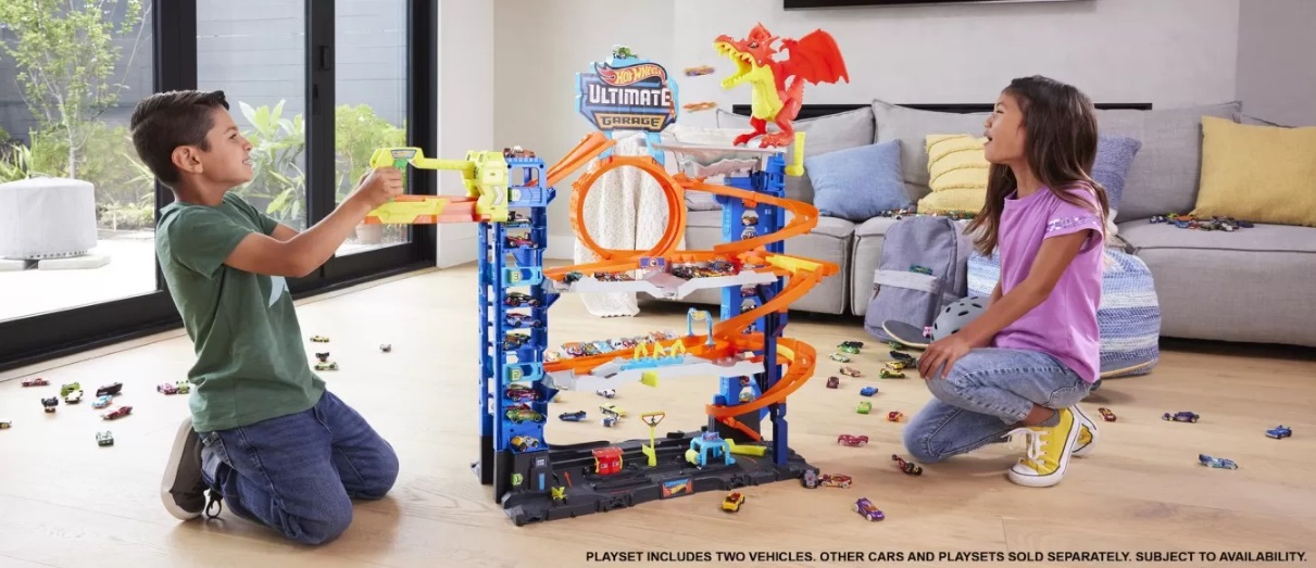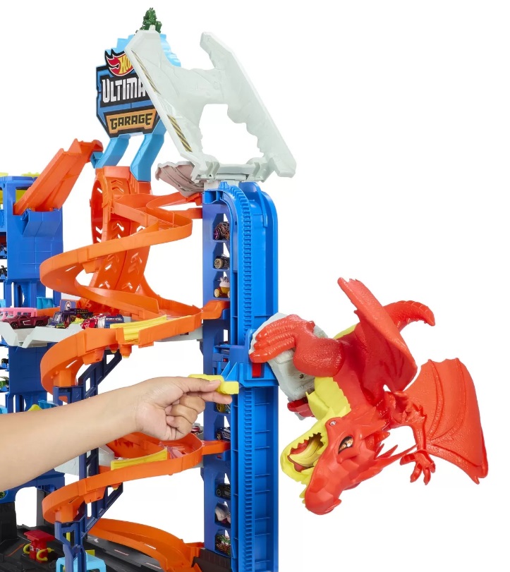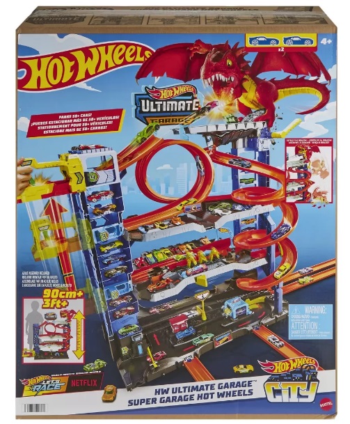 Garajul vine cu doua vehicule Hot Wheels si are suficiente locuri de parcare pentru mai mult de 50 de masinute de jucarie la scara 1:64. De asemenea, se conecteaza la alte seturi, astfel incat copiii isi pot construi orasul Hot Wheels.