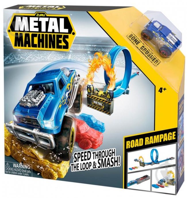 Setul de joaca Road Rampage este plin de actiune si distrugere legendara Lanseaza-l pe Bone Crusher cu puternicul lansator Metal Machines depaseste bucla de 360 de grade si sari dincolo de masini sau peste ele pentru a le distruge complet Nu te ingrijora le poti asambla din nou pentru a incerca diferite cascadorii si trucuri Acest set include o rampa de cascadorii care iti permite sa sari cu Monster Truck-ul tau. Setul include 1 Metal Machine 1 Lansator bucla de 360 3x masini de cascadorii destructibile.Specificatii