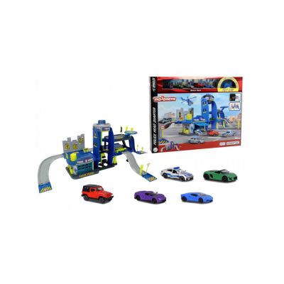 Intotdeauna se intampla ceva la sectia de politie Un oras de jucarii nu ar fi complet fara politie. Setul de jucarii include peste 100 de piese si are un turn cu lift manual un garaj cu locuri de parcare si o platforma de aterizare pentru elicopter. Luminile incorporate si efectele sonore fac ca experienta si mai realista. Punctul culminant al statiei sunt componentele care stralucesc in intuneric. Include si 5 masinute un Porsche Panamera Police Audi R8 Spyder Ford GT Lamborghini Aventador si un Jeep Wrangler.Specificatii