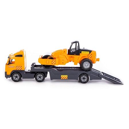 Bun venit in fascinanta lume a masinilor. O jucarie care cu siguranta il va fascina pe cel mic. Aceasta il va ajuta sa-si dezvolte abilitatile motorii imaginatia si creativitatea. Caracteristici - Setul contine tirul cu platforma si utilajul - cilindru asfalt. - Platforma se poate decupla foarte usor si astfel camionul dar si cilindrul pot fi folosite inidual. - In partea din spate a platformei este o trapa pentru urcare trapa ce se pliaza. - Rola cilindrului pentru asfaltare poate fi rotita foarte usor. - Cele 6 roti ale camionului sunt realizate din plastic si dispuse pe 3 axuri metalice. - Setul este confectionat din material plastic rezistent viu colorat. - Camionul si cilindrul imita foarte bine realitatea atat prin atentia la detalii cat si prin culorile folosite. - Jucaria ii dezvolta copilului abilitatile motorii fine imaginatia si creativitatea. Produsul avand un design similar cu un vehicul adevarat va permite copilului sa imite realitatea. - Ambalaj plasa. Avertizare Produsul este nou si comercializat in ambalajul original al producatorului. Imaginile de pe site au caracter informativ. Ambalajul trebuie indepartat recuperat si aruncat de catre un adult inainte de a se da spre utilizare copilului. Nu lasati ambalajele produselor la indemana copiilor. Se recomanda utilizarea produsului sub supravegherea unui adult. Produsul poate contine piese mici care se pot inghiti sau inhala de cei mici existand pericolul de sufocare sau nu este potrivita copiilor mai mici de 3 ani. Pastrati instructiunile si etichetele pentru referinte viitoare. Pastrati produsul departe de foc si nu il lasati in preajma temperaturilor ridicate si a umiditatii. Datorita masurarii manuale a produsului poate exista o diferenta minora fata de dimensiunea reala a produsului.Specificatii