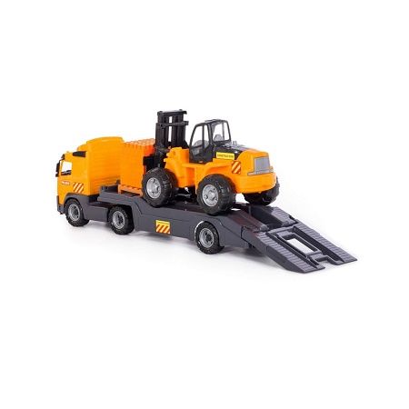 Bun venit in fascinanta lume a masinilor. O jucarie care cu siguranta il va fascina pe cel mic. Aceasta il va ajuta sa-si dezvolte abilitatile motorii imaginatia si creativitatea. Caracteristici - Setul contine tirul cu platforma si utilajul - stivuitor. - Platforma se poate decupla foarte usor si astfel camionul dar si stivuitorul pot fi folosite inidual. - In partea din spate a platformei este o trapa pentru urcare trapa ce se pliaza. - Cele 6 roti ale camionului sunt realizate din plastic si dispuse pe 3 axuri metalice. - Stivuitorul este conceput pentru a transporta marfuri pe paleti. Pentru acesta utilajul este incarcat cu un palet cu blocuri pentru constructii. - Utilajul este echipat cu doua brate care formeaza o furca ce de deplaseaza pe verticala si cu ajutorul careia se poate ridica cobori paletul de cuburi. - Paletul de cuburi poate fi folosit atat in asociere cu stivuitorul dar si inidual. - Setul este confectionat din material plastic rezistent viu colorat. - Camionul si stivuitorul imita foarte bine realitatea atat prin atentia la detalii cat si prin culorile folosite. - Jucaria ii dezvolta copilului abilitatile motorii fine imaginatia si creativitatea. Produsul avand un design similar cu un vehicul adevarat va permite copilului sa imite realitatea. - Ambalaj plasa. Avertizare Produsul este nou si comercializat in ambalajul original al producatorului. Imaginile de pe site au caracter informativ. Ambalajul trebuie indepartat recuperat si aruncat de catre un adult inainte de a se da spre utilizare copilului. Nu lasati ambalajele produselor la indemana copiilor. Se recomanda utilizarea produsului sub supravegherea unui adult. Produsul poate contine piese mici care se pot inghiti sau inhala de cei mici existand pericolul de sufocare sau nu este potrivita copiilor mai mici de 3 ani. Pastrati instructiunile si etichetele pentru referinte viitoare. Pastrati produsul departe de foc si nu il lasati in preajma temperaturilor ridicate si a umiditatii. Datorita masurarii manuale a produsului poate exista o diferenta minora fata de dimensiunea reala a produsului.Specificatii