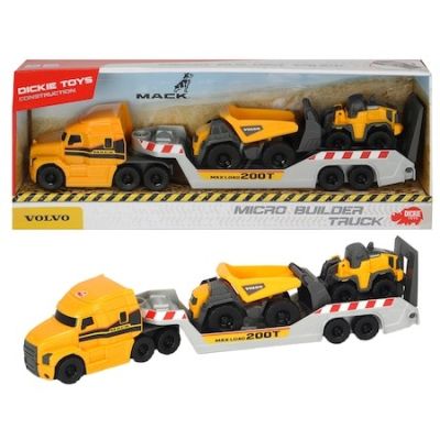 Camion Mack Volvo Micro Builder de la Dickie Toys le permite copiilor sa-si recreeze viata pe un santier la scara larga. Remorca camionului poate fi detasata. Set compus din camion cu remorca, buldozer si camion basculant. Fabricat sub licenta Volvo. Lungime camion cu remorca: 32 cm. Lungime buldozer: 9 cm. Lungime camion basculant: 9 cm.