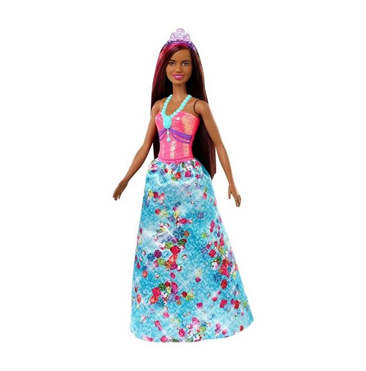Aceasta papusa printesa Barbie este imbracata pentru o ocazie regala intr-un corset purpuriu si roz si o fusta vibranta, cu un imprimeu instelat in curcubeu.