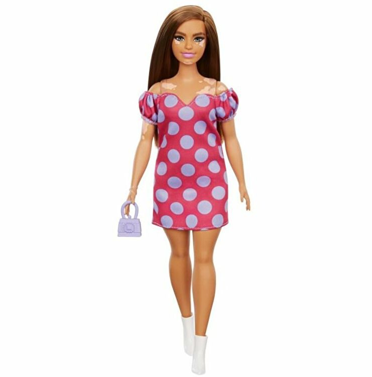 Fashionistas este una dintre cele mai indragite colectii Barbie, oferind o gama larga de papusi cu diferite stiluri si accesorii, introducand conceptul de diversitate si acceptare in randul fetelor. Aceasta colectie include papusi cu diferite tipuri de siluete, tonuri de piele, culori de ochi si par, astfel fetele nu se vor plictisi niciodata si isi vor gasi papusa asemanatoare stilului lor. Papusile au stilul lor propriu, inspirat de ultimele tendinte din moda si vin cu o tinuta completa, incaltaminte si accesorii fabuloase. Hainutele sunt confectionate astfel incat se pot potrivi oricarei papusi din gama Fashionistas. Descopera fiecare papusa Barbie din colectia Barbie Fashionistas si exploreaza lumea minunata a modei! Papusa satena este imbracata intr-o rochie roz cu buline mov iar in picioare are o pereche de botine albe. Tinuta este completata o geanta mov.