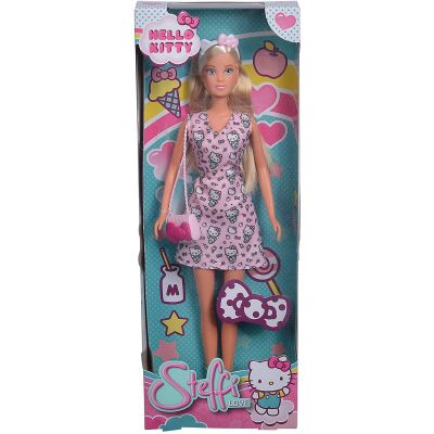Steffi este imbracata intr-un frumos costum cu model Hello Kitty si iese la plimbare. Inaltime papausa 29 cm. De asemenea, poarta tocuri inalte, o bentita si o poseta mica. Papusa poarta o tinuta roz deschis.